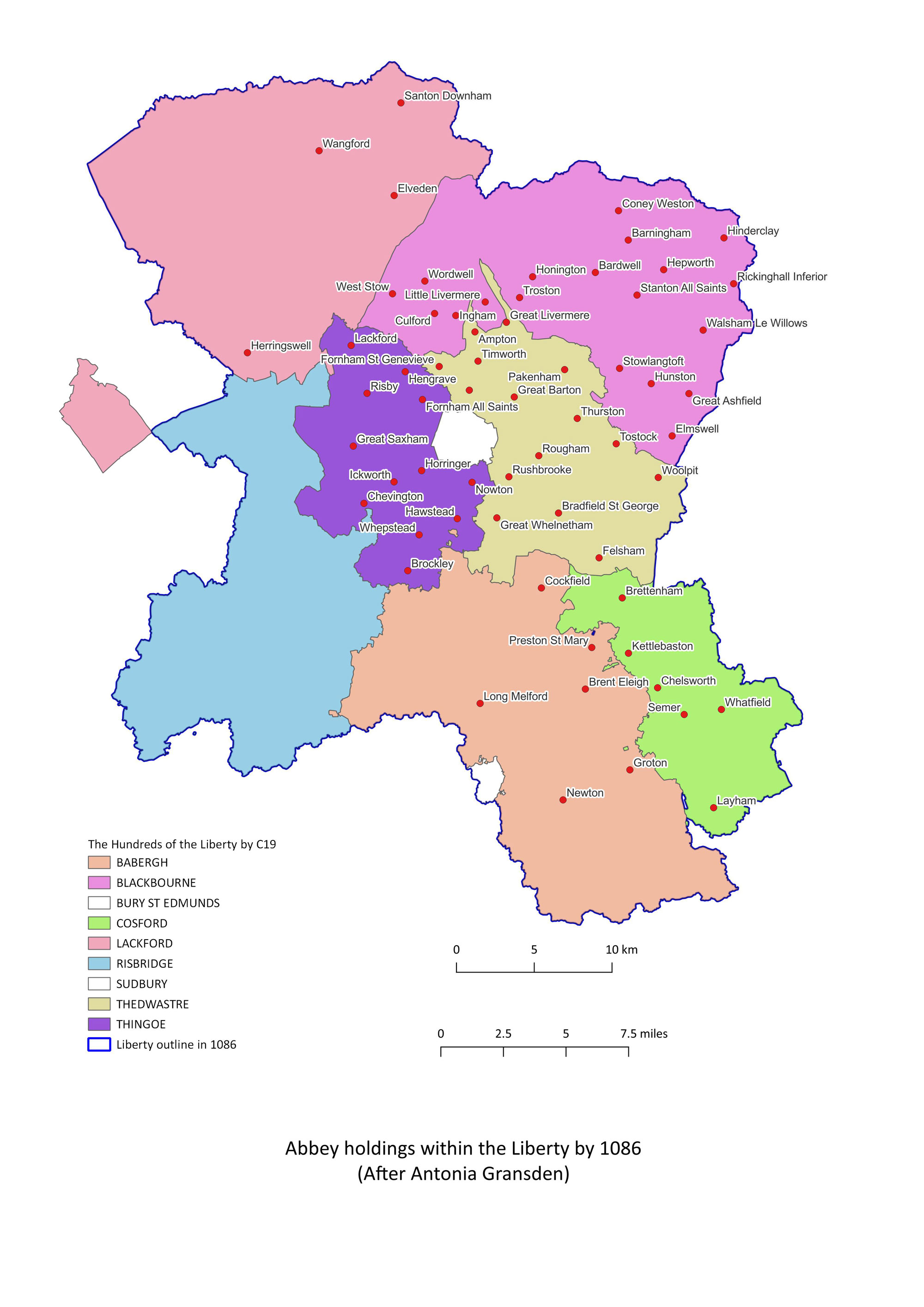 Held in 1086Holdings of the Abbey of St Edmund in 1086 - Inside the Liberty of St Edmund. This map is based upon those included in "History of the Abbey of Bury St Edmunds", by Antonia Gransden. The shaded areas are the Hundreds within the Liberty of St Edmund. |