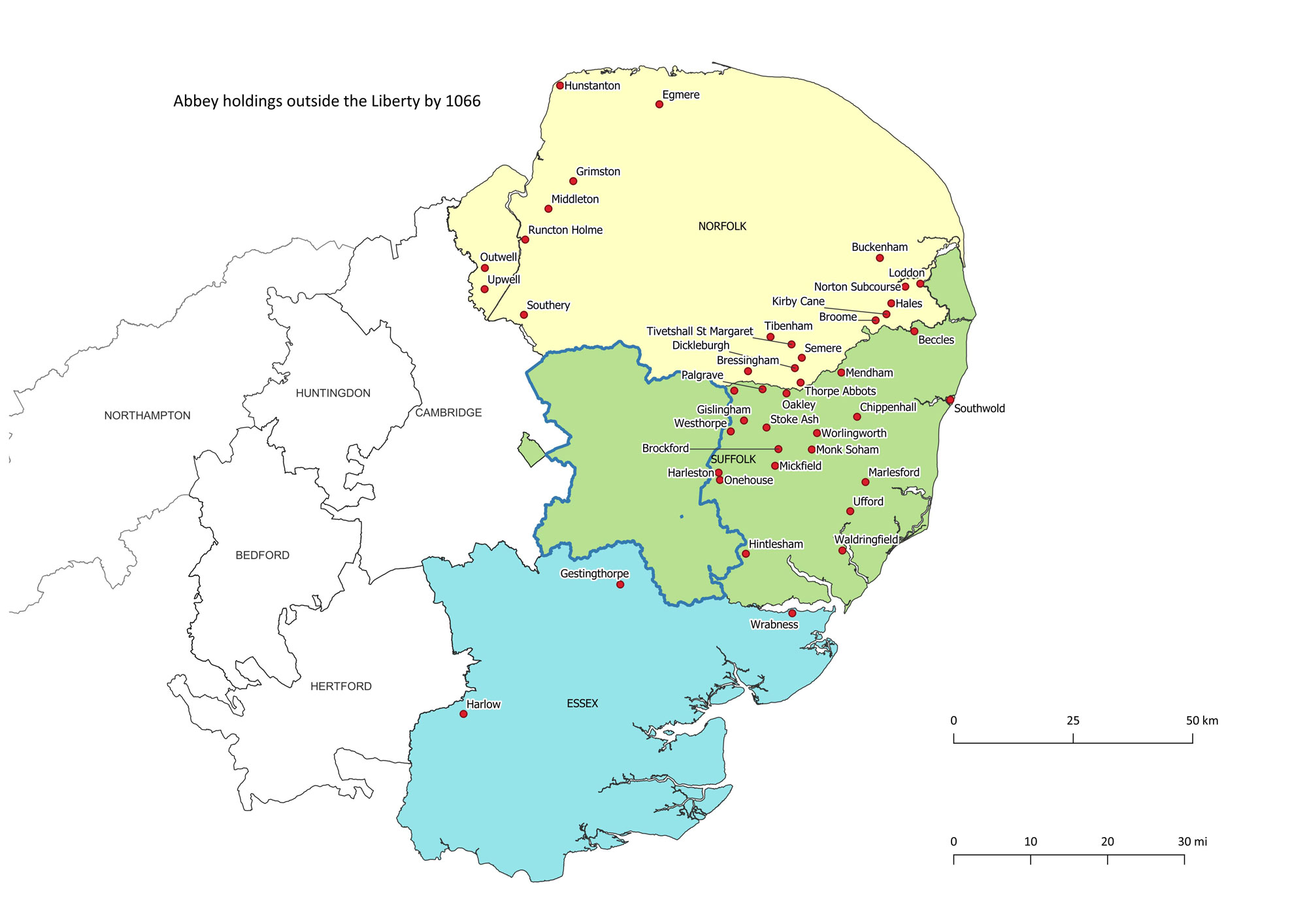Held in 1066Holdings of the Abbey of St Edmund in 1066 - Outside the Liberty of St Edmund. This map is based upon those included in "History of the Abbey of Bury St Edmunds", by Antonia Gransden. The shaded counties are those where some holdings are located. |