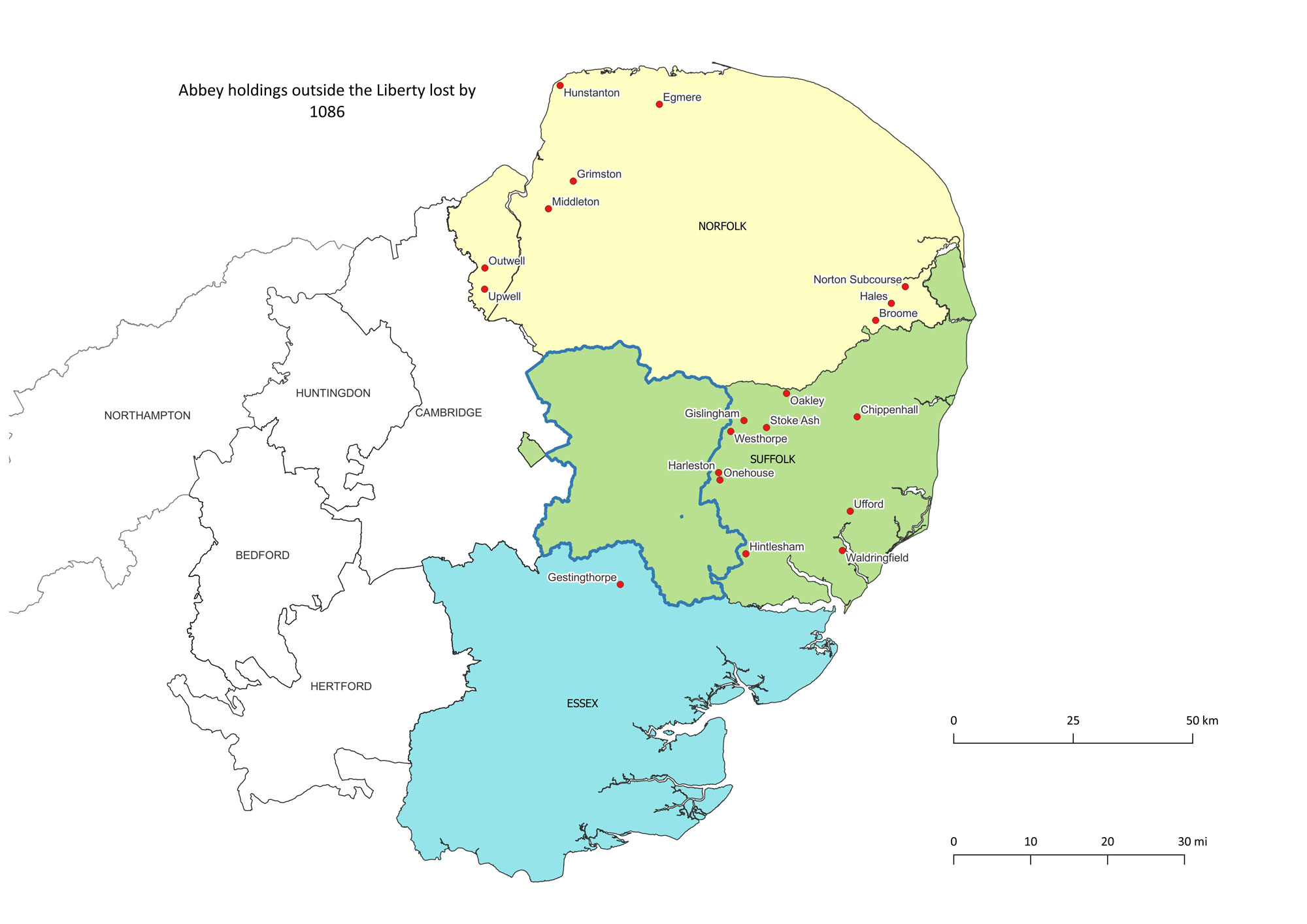Gained by 1086Holdings of the Abbey of St Edmund gained between 1066 and 1086 - Outside the Liberty of St Edmund. This map is based upon those included in "History of the Abbey of Bury St Edmunds", by Antonia Gransden. The shaded counties are those where some holdings are located. |