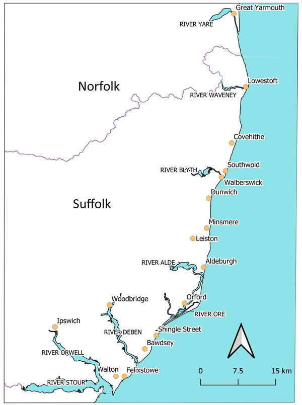 The The River Deben and the coastline by around 1600. This is Figure 31 in the SIAH article. While deposition has encouraged further land reclamation, Bawdsey Cliffs have experienced erosion. Goseford port is now associated with the Deben and Bawdsey Fleet area as Oxeneye has become cut off from the sea. |