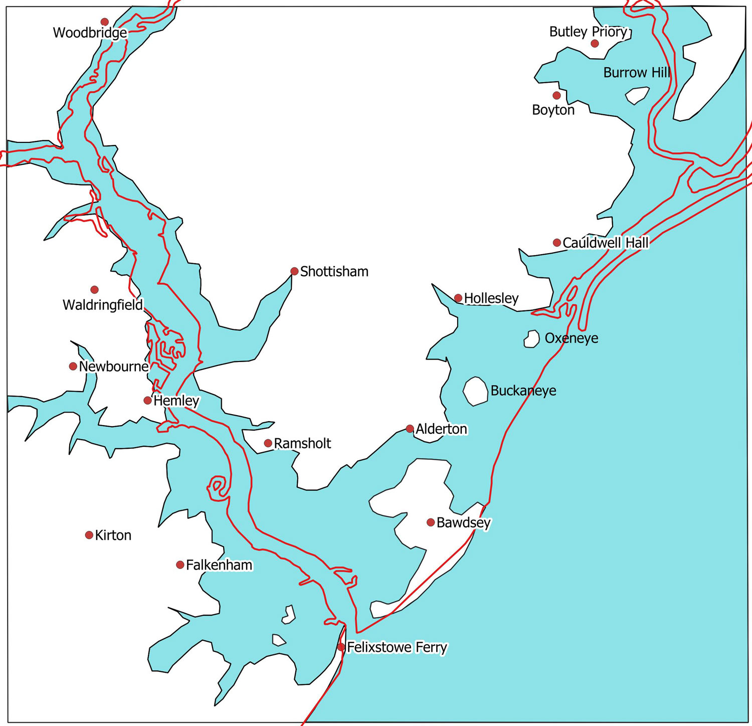 The High Tide line according to LIDAR, overlaid by the modern coastline shown in red. This indicates that much of the inland area here today is below sea level and liable to flooding. |