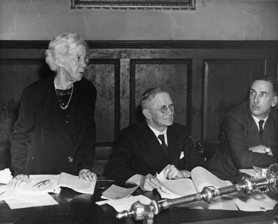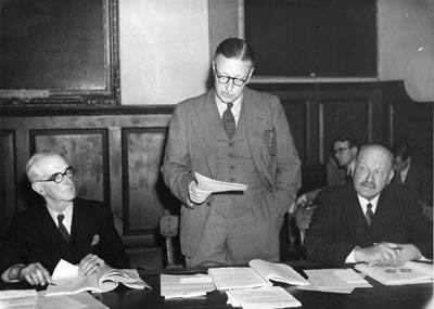 Cllr H I Jarman, (Chairman of Museums and Libraries Committee), Cllr R V Willcox, (Chairman of Housing Committee), and Cllr R J Gooch Cllr Willcox stands to present the report of the Housing Committee, saying that 21 houses were completed by private builders and 4 by the council. The Minister of Health wanted 4 council houses built for every one house built by private enterprise, and might ban further private building until that proportion was established. |
