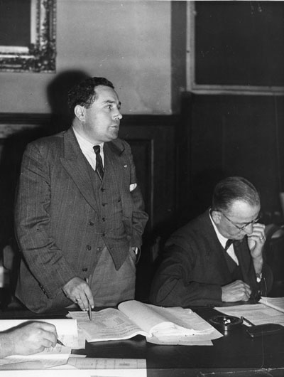 Alderman F T Bright replies to the Mayor, Alderman Sewell, after the Mayor had reported on an address by Aneurin Bevan at the Housing Conference. Alderman Bright was saying that shortages were very real, and delays were not the fault of municipal authorities. "Pipes ordered last March are now needed to complete some of our houses, but they may not be available until next March." |
