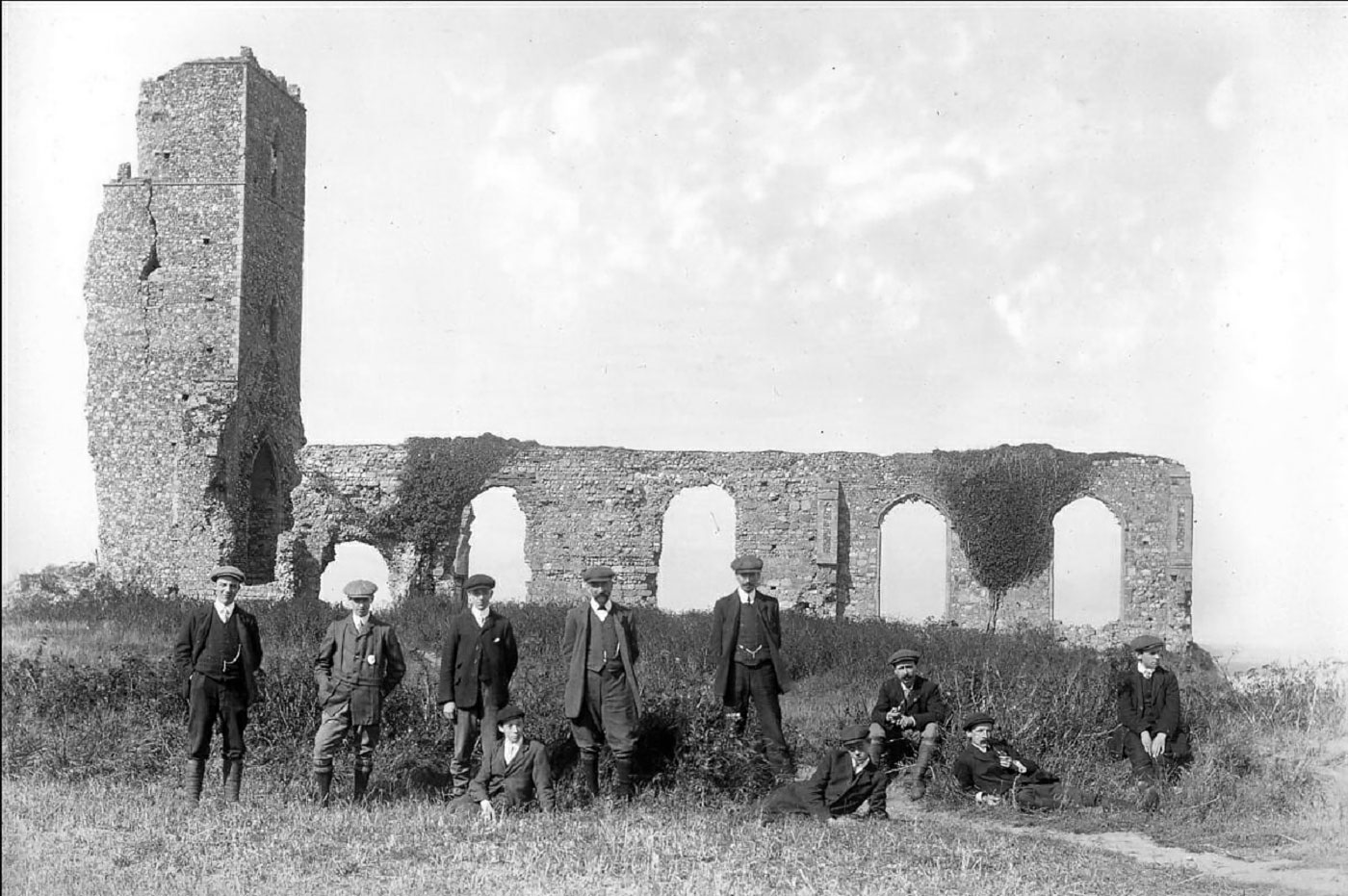 In 1904 this postcard shows the ruins of All Saints church in Dunwich. Later postcards shows these ruins gradually reducing in size as the they fall into the sea . All Saints finally disappeared in 1919. |