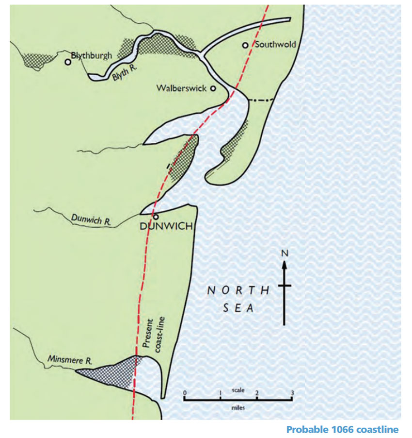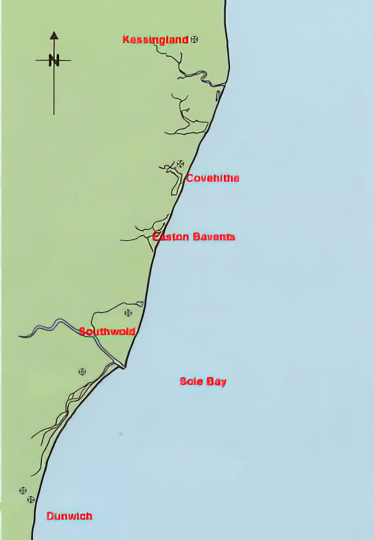 This map from the Southwold Museum's online resources shows the Sole Bay as it might have looked in the 11th Century. The Museum comments that "Sole Bay really was a bay set between the twin promontaries of Easton Bavents and Dunwich." |