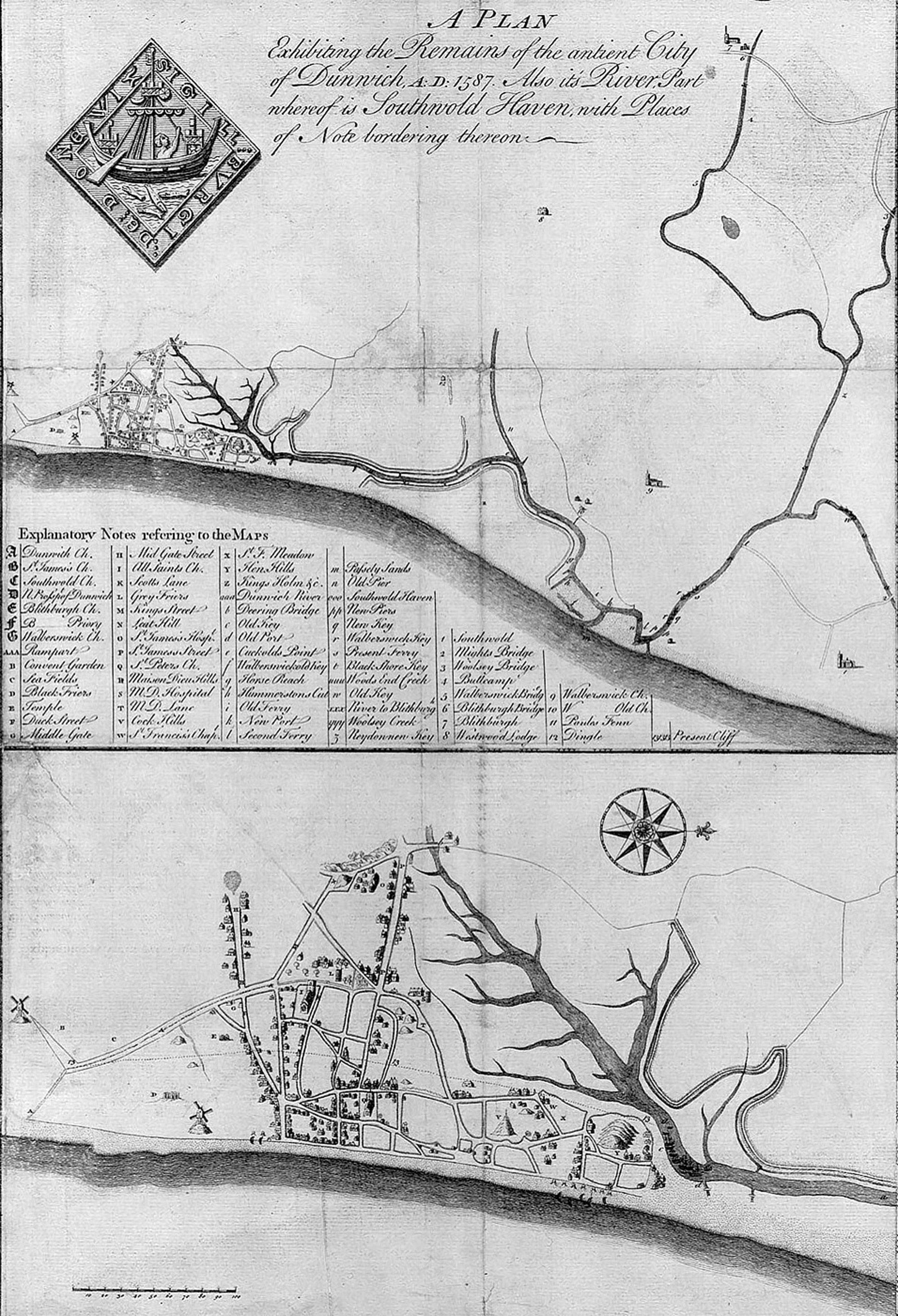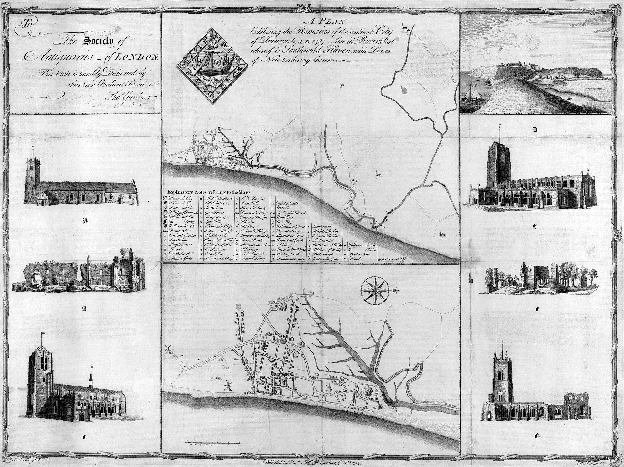 This full plan, with illustrations, was published in 1753 by Thomas Gardner for the Society of Antiquaries. It shows "The remains of the antient city of Dunwich AD 1587. Also its River, part whereof is Southwold Haven, with places of note bordering thereon." |