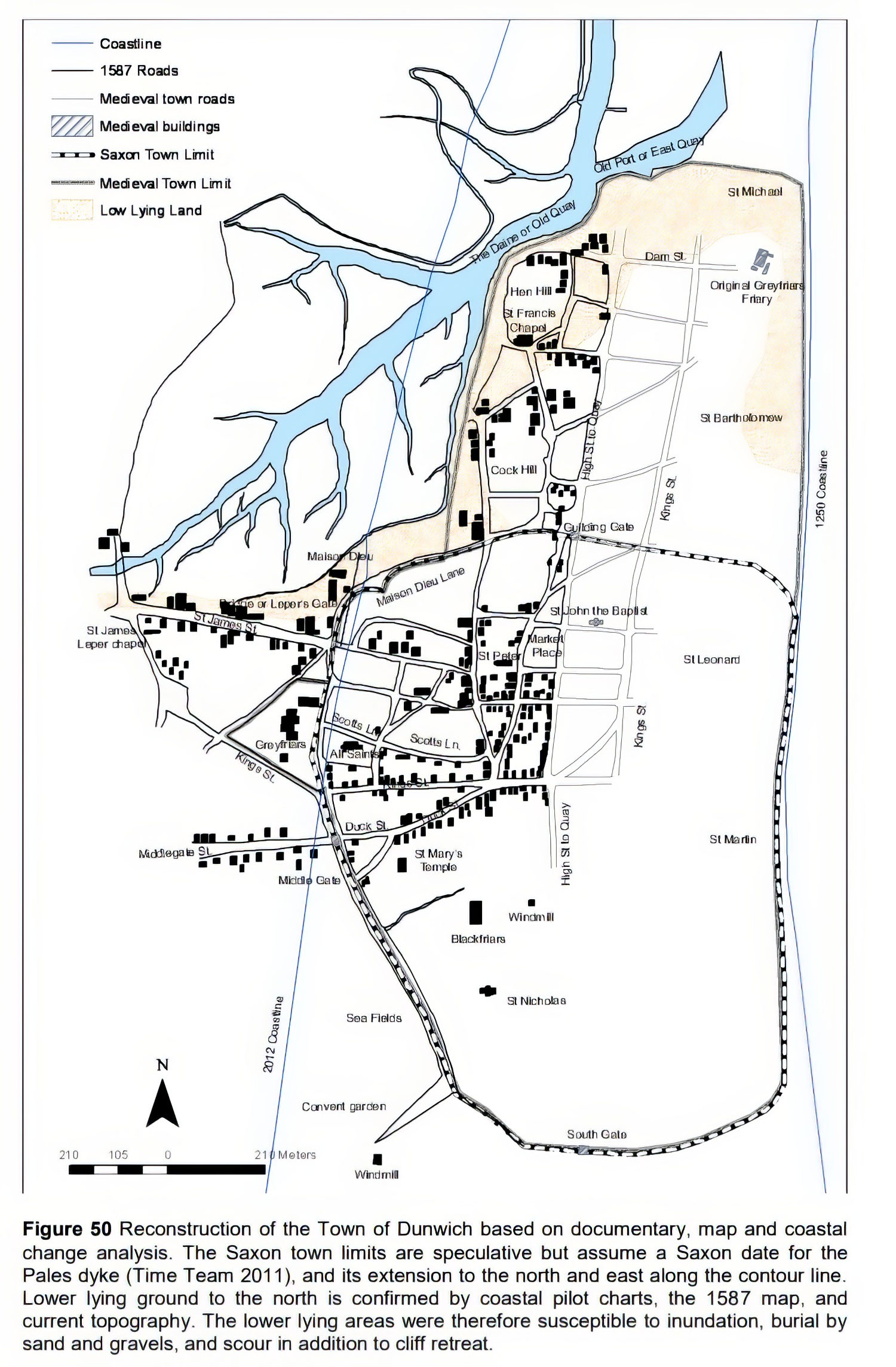 This reconstruction of old Dunwich comes from the "Dunwich Project 5883 Final Report" by David Sear, Andy Murock, Tim LeBas, Paul Baggaley and Gemma Gubbins, of March, 2013. This has resulted from a combination of historical records, coastal change analysis, geophysical surveys, diver surveys and sonar imaging. |