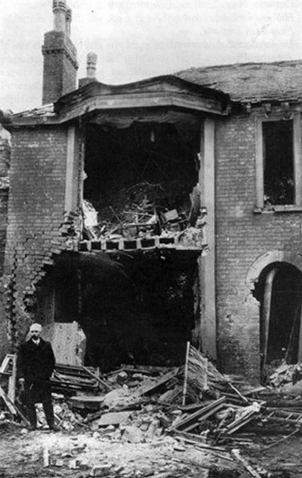 Ipswich attacked on April 30th 1915. This is another view of the same properties at Rosebery Villas in Brooks Hall Road hit by an incendiary bomb. Great Yarmouth had been attacked on the same night, and, after bombing Ipswich Zeppelin LZ38 then proceeded along the A45 to attack Bury St Edmunds. (See page 4a for the damage at Bury)