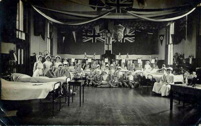 At first the normal hospital facilities took battle casualties. But there was soon an overwhelming need for more facilities and local mansions were requisitioned wholly, or in part, to be converted to hospitals. Picture in West Suffolk Hospital by Walton Burrell, negative 2052. (Gerald Brown collection.)