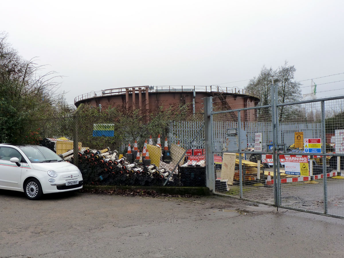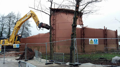 This distant view seen from the Station Hill in December, 2015, shows the cap of the gasholder in the process of removal. You will need to click on the image to see the larger version. |