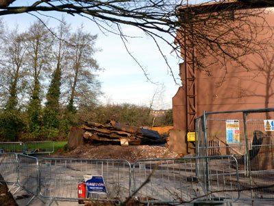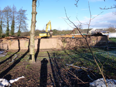 When serious demolition began, it was necessary to cut a new access through the existing pedestrian gate and adjacent hedgerow. This would allow the heavy machine needed for this work to gain entrance on to the site. (Picture dated 16th December, 2015.) |