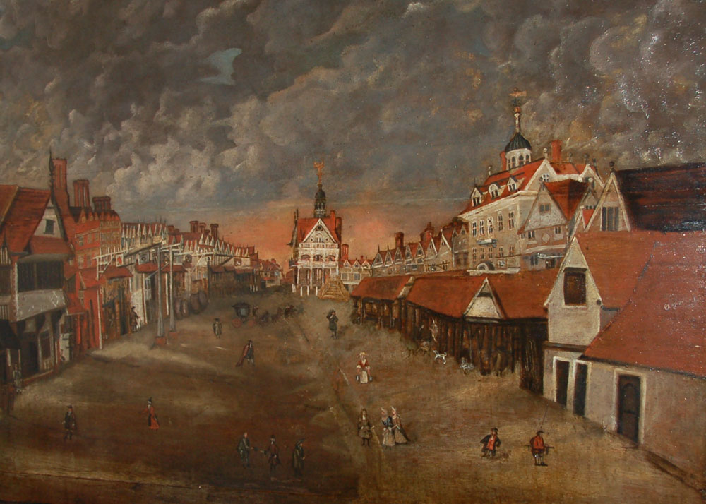 Another picture from around 1700 shows the view of the Market Cross, and Cupola House. |