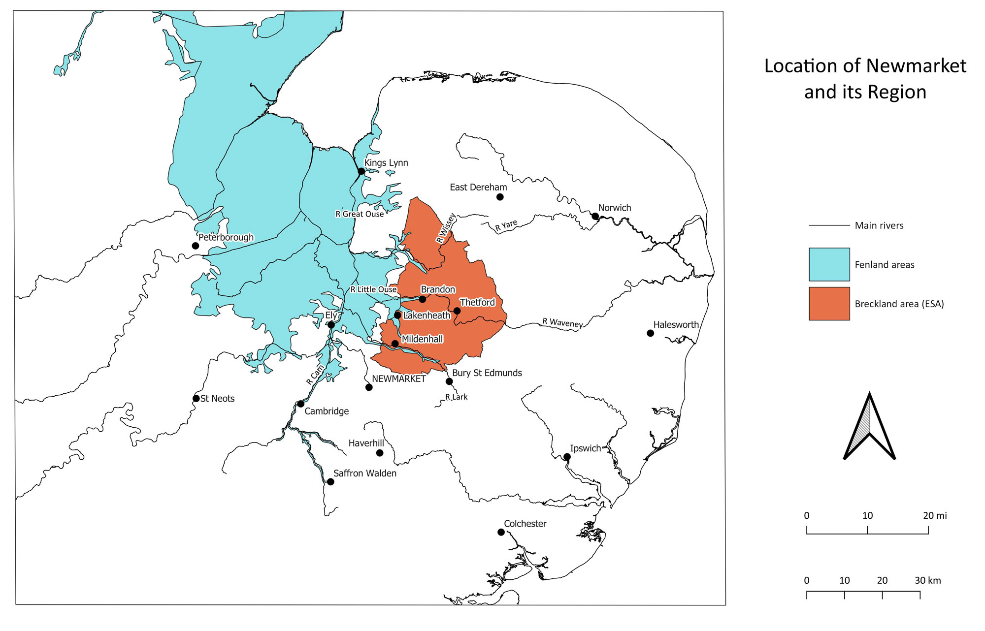 Newmarket in its regional context. Newmarket did not have the advantage of any major river connections. It was on a very minor stream east of the Great Ouse. Its road links however, were exemplary for the time, giving easy links to produce from the fens and the Breckland and surrounding agriculture, and to trade with Thetford, Norwich and relatively easy routes to London.