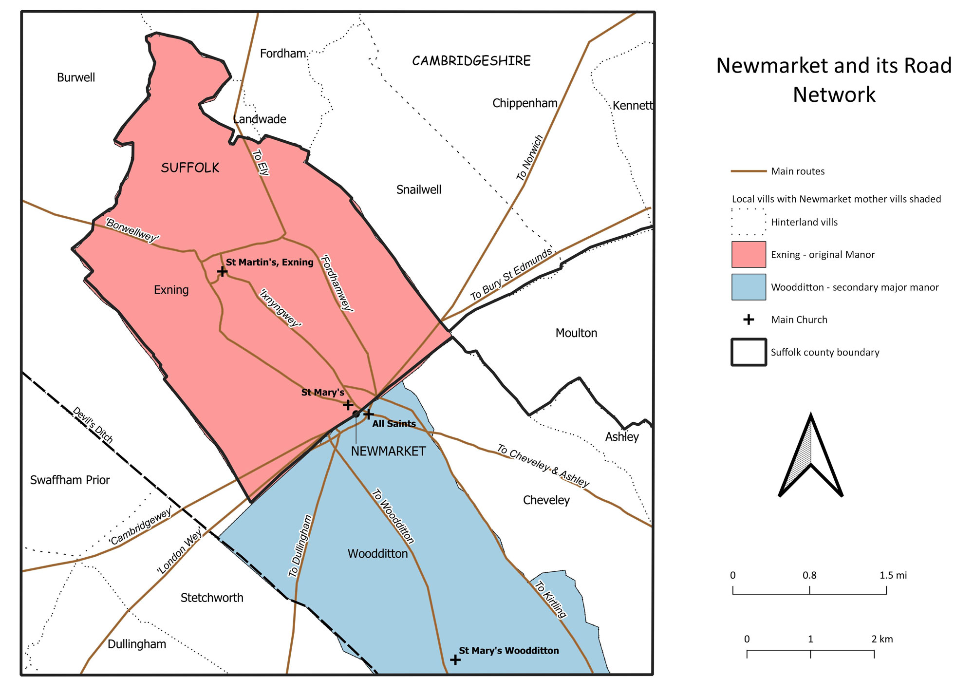 Newmarket's "mother" vills and major routeways. Newmarket High Street was basically along the route of the Icknield Way, later becoming the major route from London to Norwich. The High Street also sat between the vills of Exning in Suffolk, and Woodditton in Cambridgeshire.