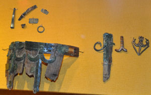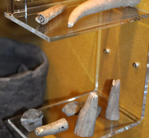 A bucket mount from West Stow cemetery, and a toy bone whistle from Bury St Edmunds. The bucket mount has two in-turned beaked heads, a common motif at this time. |