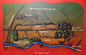 This painting of the Village and its setting, as it might have been around 550 AD, hangs in the Centre exhibition area. Painted by Jackie Cotton. |