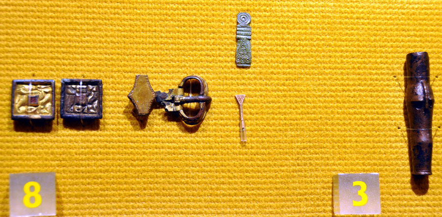 Object 3 is a bronze terminal in the shape of a stylised boar's head from Icklingham. Number 8 is a gilt bronze and garnet belt buckle set from Eriswell. |