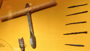 This picture shows the remains of an iron spoon-bit. A reconstruction shown here illustrates how it originally looked. It was used to bore holes in timbers as part of the building of a house or other woodwork. |
