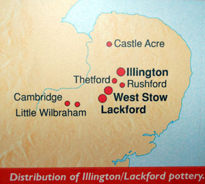Pottery attributed to the so-called Illington-Lackford pottery workshops. These are dated to the late 6th century and are found in many parts of western East Anglia, including West Stow. |