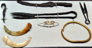 Unusual metal grave goods from the female burial in grave number 36 excavated at Westgarth gardens in Bury St Edmunds. The ring is a bronze mount from a wooden bowl. |