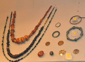 West Stow Cemetery beads. Object 3 is an annular brooch in cast bronze. 4 is a bronze bracelet. 9 is two silver pendants. |