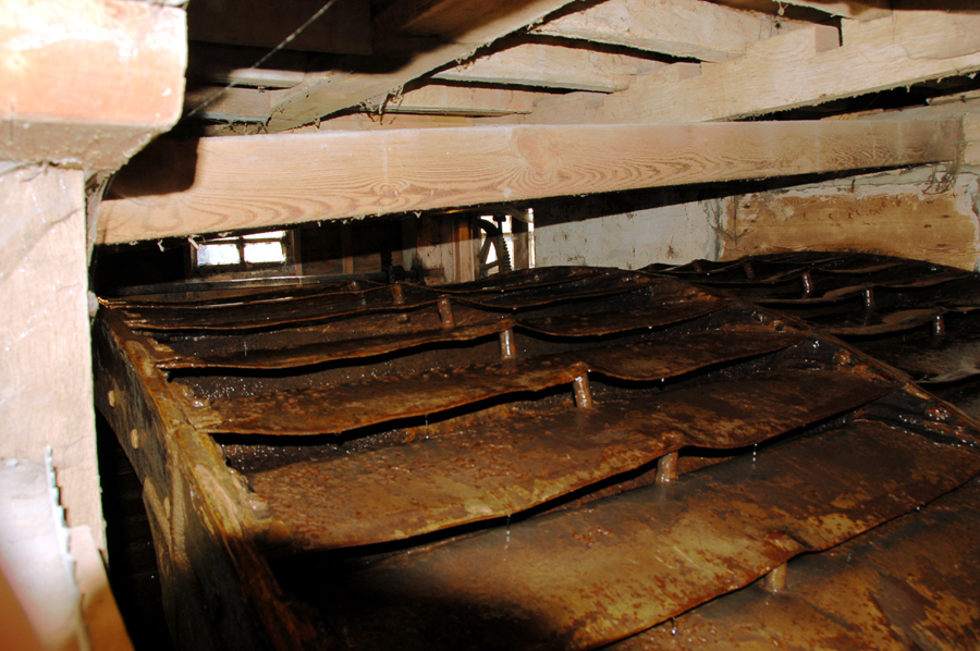 Pakenham Water wheel is 16 feet high, and is the source of the mill's power. Each spoke bears the impress 'W PECK BURY'. This cast iron wheel was originally designed by Walter Peck, millwright of Sparhawk Street, Bury St Edmunds, and cast at Cornish and Lloyd's foundry in Risbygate Street, Bury, in 1898. |