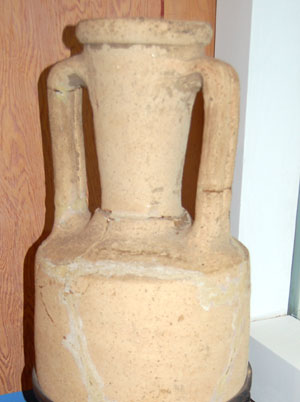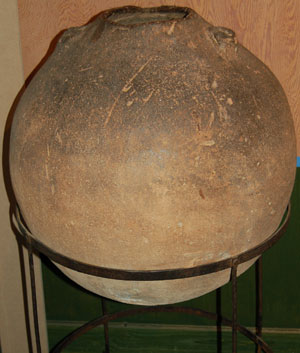 Globular Amphora from Hawkedon. It is Roman, from the 2nd century AD, and originally held olive oil from southern Spain. When found in 1880 it contained two figurines of the goddess Venus, and may have been used as a cremation urn. |