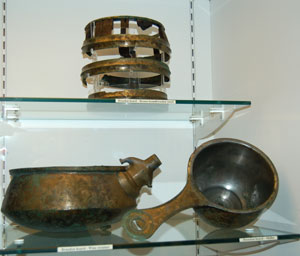 The Romans conquered Britain in 43 AD. By 61 AD Boudicca of the Iceni tribe led a national revolt against them. Many objects were probably buried for safekeeping at this time. This is part of the Brandon Hoard of bronze objects dating from this period. The iron bound bronze cauldron reflects the importance of feasting, as do the wine strainer and the skillet. |