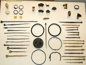 An assortment of Roman age pins, bracelets, rings and hairpins in bone and metal. |