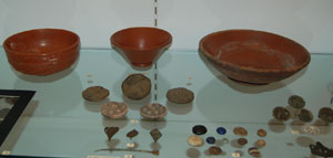 Three Samian ware pots and an assortment of Roman objects. Samian ware dates from the 1st century to the early 3rd century AD. It was made in large factories in central France. We regard it as high status pottery, perhaps analagous to Wedgwood or Royal Worcester today. These pots were found at Ixworth and Ingham. |