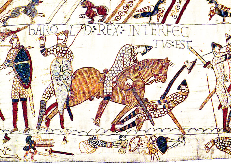 The fighting largely ended when Harold was killed, but whether he was ever hit by an arrow is uncertain. He was hacked to pieces by Norman Knights who punched through the arrow weakened shield wall. The Bayeux Tapestry shows a figure under the word "Harold" with an arrow in the eye, but next to him another figure is attacked by mounted knights, under the words "is killed" or "interfectus est". The housecarls seem to have fought on to the death, while the fyrdmen fled.