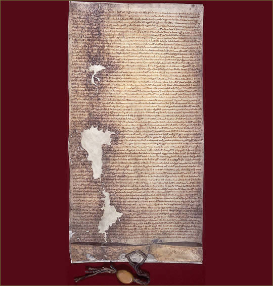 By May 1215 the Country was in a state of Civil War. King John wanted to annul the Coronation charter of Henry I, and we have seen that the Barons wanted him to agree to a new Charter of Rights. The northern Barons were mostly united against the King. Elsewhere he was not so solidly opposed. On 17th May the Barons seized London giving themselves a decisive bargaining counter. The Archbishop of Canterbury, Stephen Langton, mediated between the parties, while trying to maintain church privileges. He tried to help Hugh return to the King's good graces, and urged him to act before it was too late. After sending Richard of Saxham to plead for him, Hugh was sent a conciliatory letter by the King, asking Hugh to attend upon him without delay. By the evening of 9th June, Abbot Hugh and the main Abbey officers were at Windsor with the King. Hugh had to attend the King next day at Staines meadow, and he was finally accepted by the King on 10th June. Hugh was to be Abbot of Bury until 1229, when he became Bishop of Ely.
