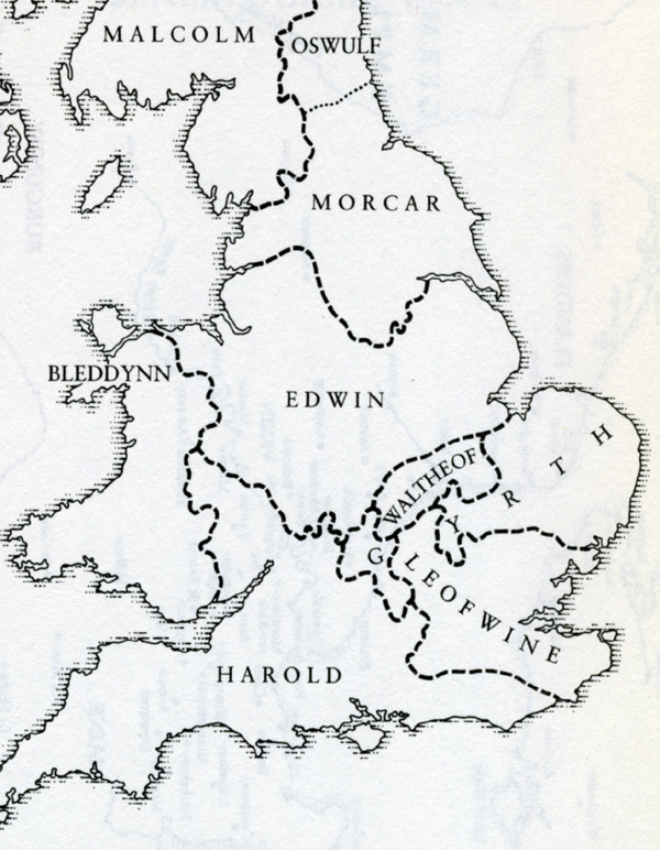 Morcar was at this time the Earl of Northumbria. He was given this Earldom after Tostig, one of King Harold's brothers, had been exiled. Tostig had ruled Northumbria so badly that his own people rebelled against him, and threw him out in 1065. Harold had been sent to stop this rebellion, but found that there was no way in which the people of Yorkshire would take Tostig back again. Thus he recommended to Edward the Confessor that Tostig be exiled. Tostig never forgave Harold for this. Morcar's own brother, Edwin, was the Earl of an enlarged Mercia. Gyrth, one of King Harold's brothers, was Earl of East Anglia, and another brother, Leofwine was Earl of Essex. Harold himself held the Godwine family Earldom of Wessex.