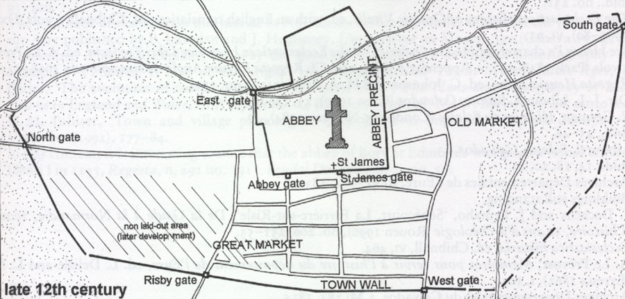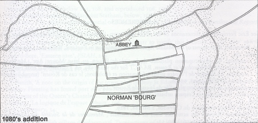 The illustration shows the old Saxon town layout as envisaged by Bernard Gauthiez before Abbot Baldwin embarked upon major construction works both at the monastery site and in the town.