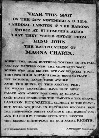 The names of the Barons involved are recorded on the stone tablet shown here. The names can be read by clicking on the thumbnail picture, but this is not a reliably accurate reckoning of who was there.