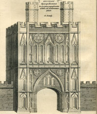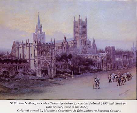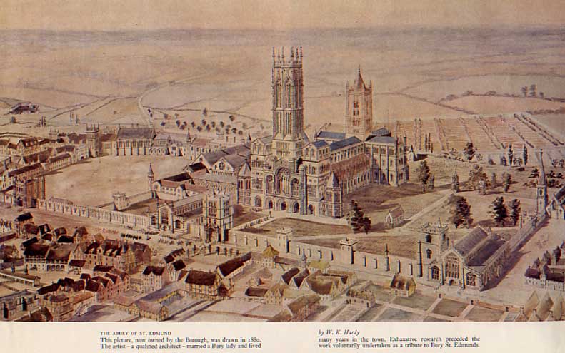 "Why need I in this place extol Bury at greater length? This only will I add, that the sun does not shine on a town more prettily situated, so delicately does it hang on a gentle slope, with a little stream flowing on its east side, nor on an abbey more famous, whether we regard its endowments, its size, or its magnificence. You would aver that the Abbey was a town in itself; so many gates has it - and some of them are even of bronze - so many towers, and a church surpassed by none, under whose shadow, in the same churchyard, stand three more of the most excellent design. The streamlet, which I just now mentioned, flows through the midst of the abbey precinct, gaining access thereto by a double bridge vaulted over it."