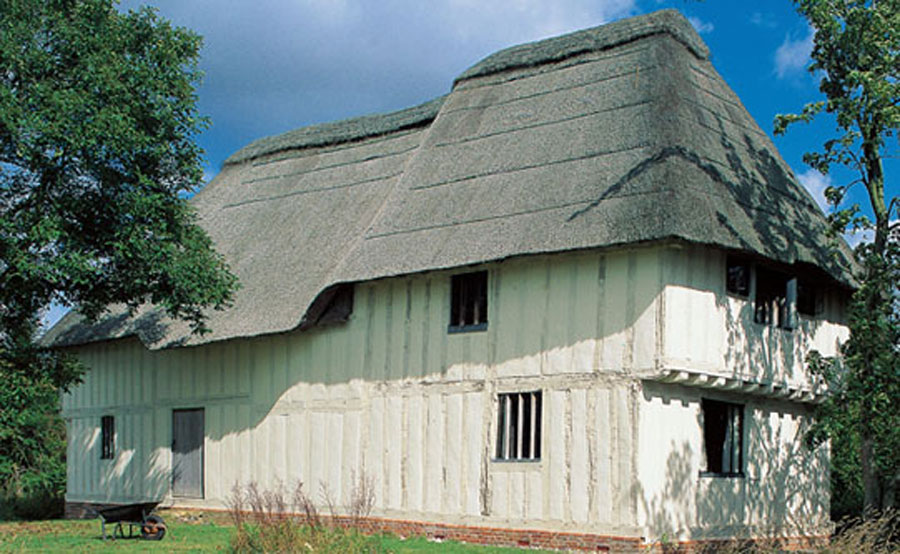 Purton Green is one of the lost villages of Suffolk, where generations spent their lives, but which are now just patches of lime and fragments in the plough. It lies on an old road running south from Bury St Edmunds to Clare via Gatesbury's Farm. Today it hardly survives as a path, and access is from the south, requiring a ford crossing, and a 400 yard walk. All that remains of a village is this house. Inside its late medieval walls survives a hall of 1250 – a great rarity. Aisled on both sides, with scissor-braced trusses and a highly ornamental arcade at the low end, it must once have been an important place. The high end of the house dates from a rebuild in about 1600.