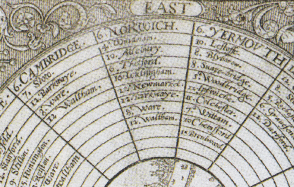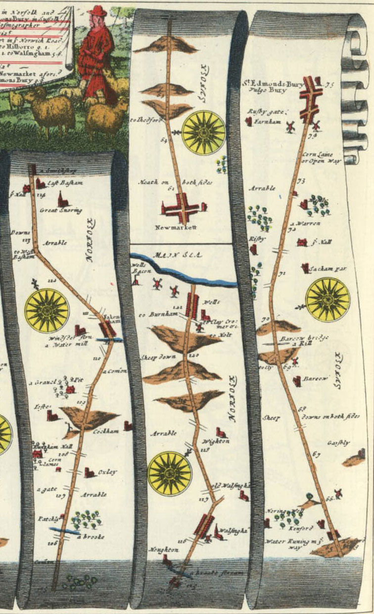 As Beccles was low lying it was subject to flooding, "so that the roade lay under water which is very unsafe for strangers to pass, by reason of the holes and quicksand and loose bottom. The people of Suffolk and Norfolk knitt much and spin, ... others at their wheeles out in the streete and lanes as one passes." "The miles here are as long again as about London, and pretty deep way especially after raines, these miles are much longer than most miles in Yorkshire."