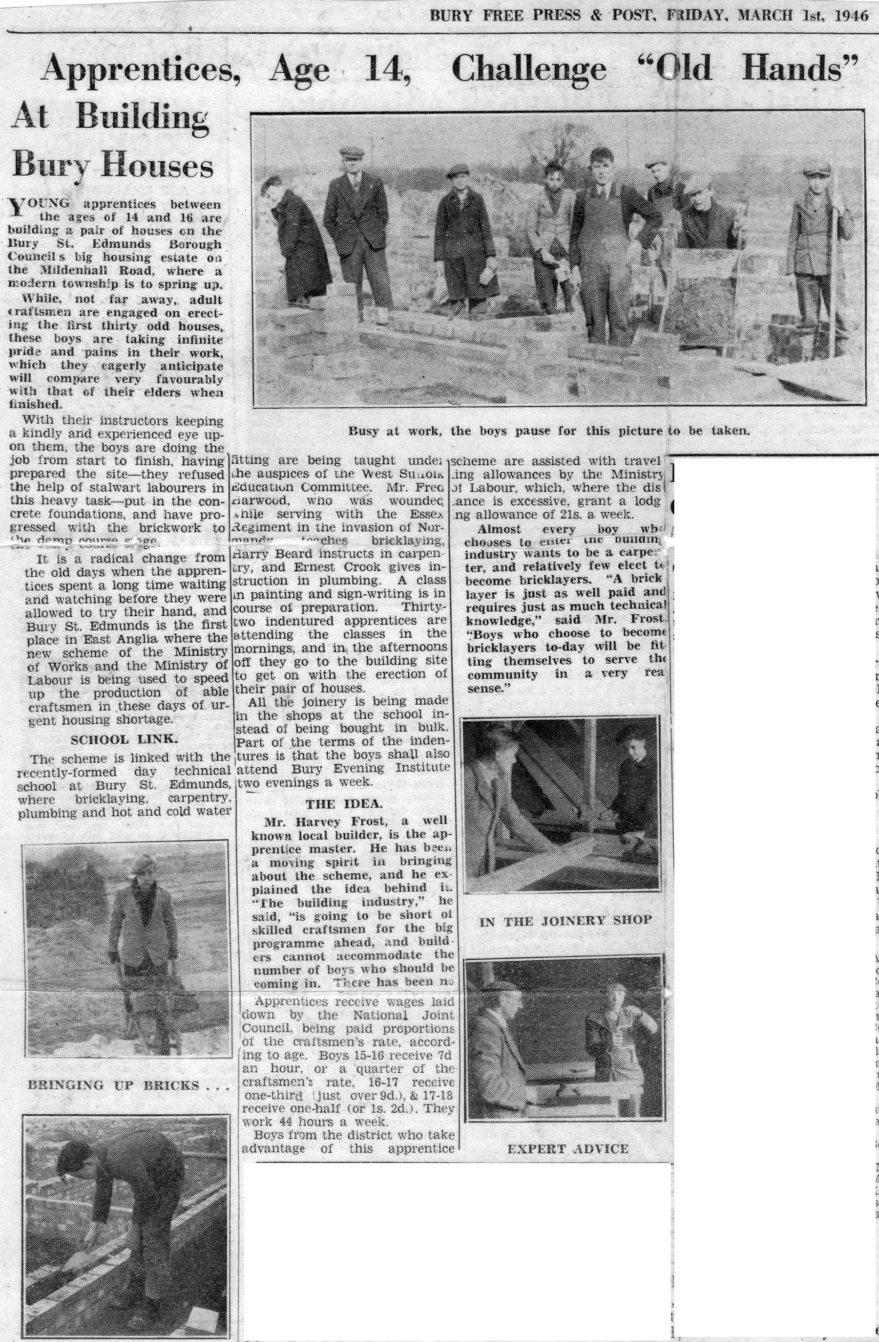 On 1st March, 1946, the Bury Free Press reported on another scheme to address labour and skills shortages. It reported on the new apprentice training scheme taking place on the Mildenhall Estate, under the auspices of Harvey Frost, a local builder. Under the new scheme set up by the Ministry of Works and the Ministry of Labour, Mr Frost was designated an official "Apprentice Master". There were 32 boys who are aged between 14 and 16 years old, learning on the job in the afternoons and also attending technical classes in the mornings. Nearby, Harvey Frost's firm was building a contract of 30 new homes using normal labour. The full text of the article may be seen by clicking on the thumbnail.