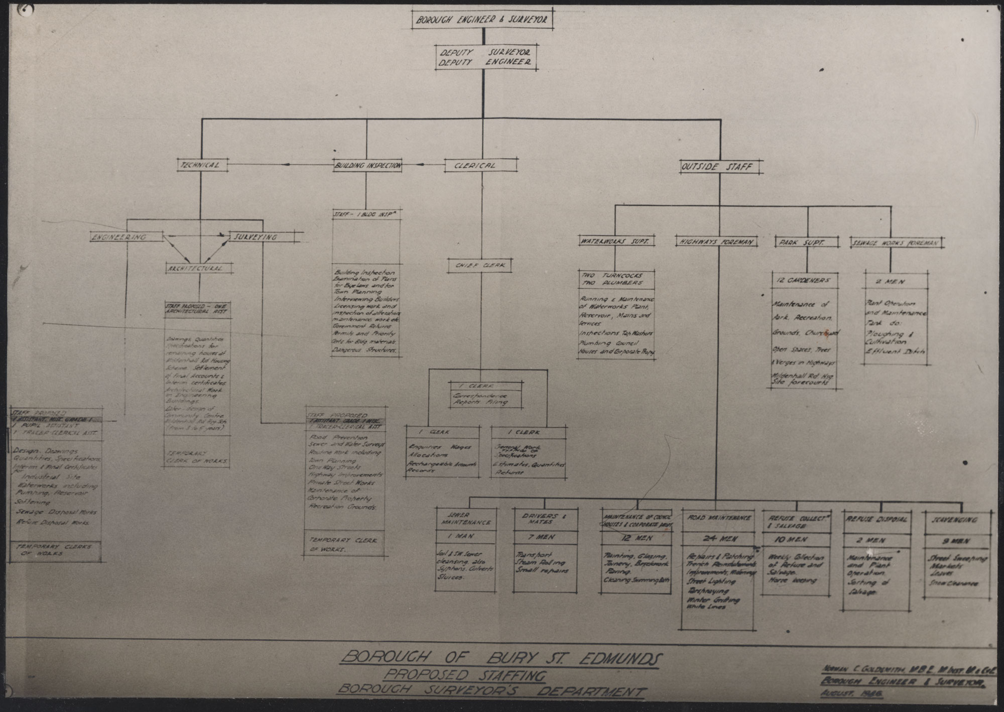 In order to carry out the works required around Bury St Edmunds, the council needed sufficient qualified staff to design and manage the work. This diagram shows the new staffing structure proposed by the Borough Engineer and Surveyor.
