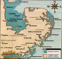 The East Anglian Daily Times published this map in its October 19th issue, showing the possible effects of inundation by the sea by 2050 if warming continued. With 20% of East Anglia below sea level, Thetford and Cambridge would become seaside towns, while Great Yarmouth and Lowestoft could disappear.