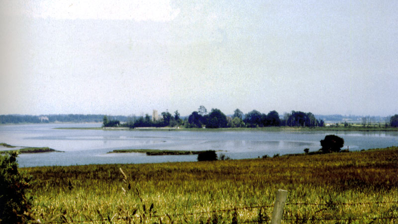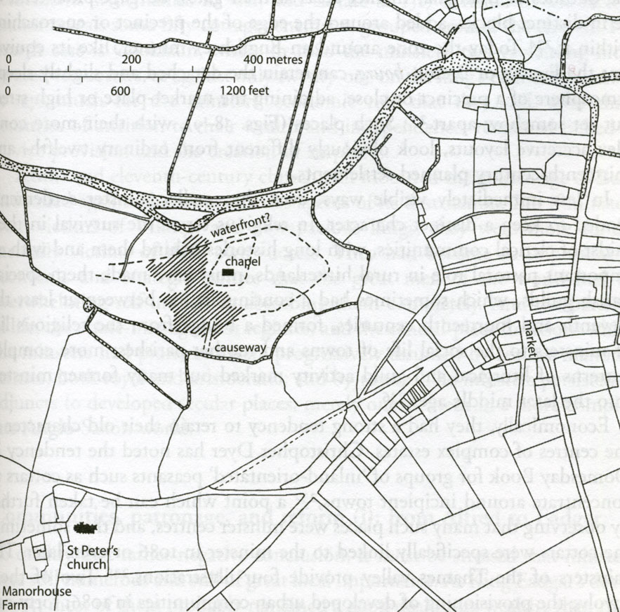 By about 850 it seems that the thriving monastic institution at Brandon, located in Staunch Meadow, was abandoned. The site was surrounded by marsh and water, reached by a built up causeway. The town grew up to its east side, and the site reverted to grazing marsh. A later chapel marked the site. Excavations on this site do not reveal a Viking destruction, but rather, one of those shifts of settlement which seem to have occurred in Saxon times. The new site was probably more comfortably away from the marshes, and their periodic floodings.