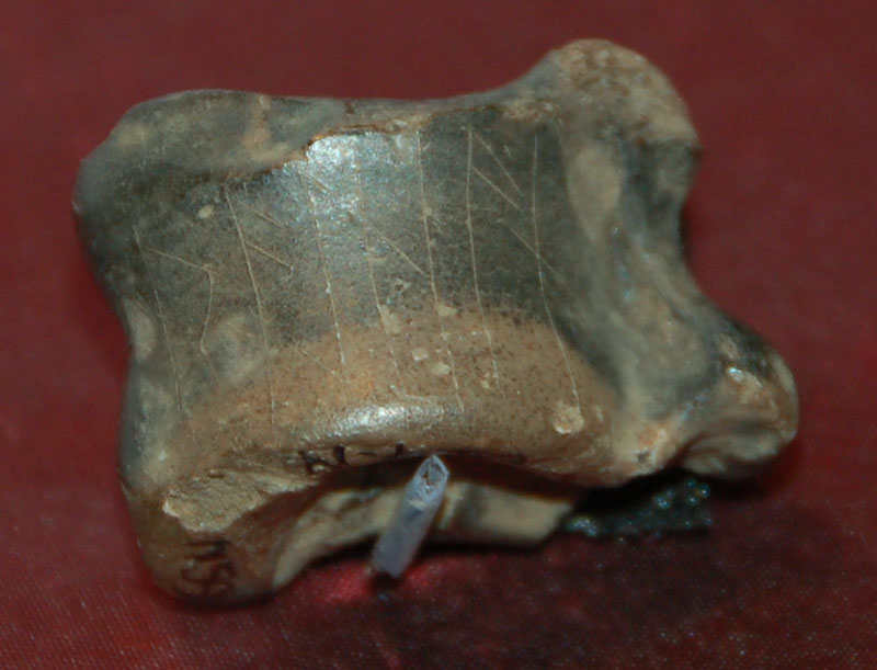 After a short time the number of Saxons allowed to settle increased and new areas were penetrated. Very early remains have been found at Caistor by Norwich, Luton and Abingdon. This roe deer foot bone was excavated at Caistor by Norwich, and was used as a gaming counter. The runic inscription indicates that it was of north german origin, showing evidence of the new language penetrating British life. The runes spell "raihan", meaning roe deer, and such cryptic inscriptions typify the earliest runes found in this country. This small piece of bone may, in fact, carry the earliest known use of runes in Britain.