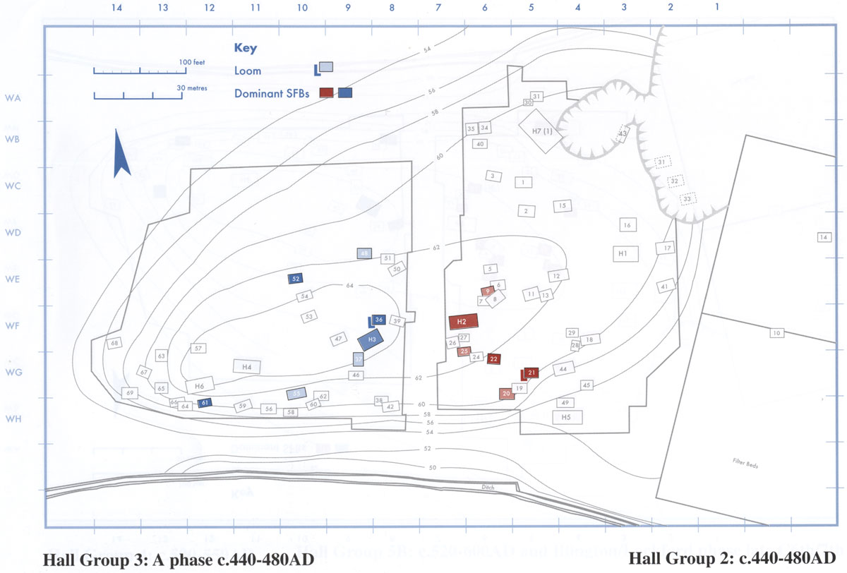 In his book "West Stow Revisited" (2001) Dr Stanley West explained his views of the chronology of buildings at West Stow. He believed that from c440 AD to c480 AD there were these two family groups of buildings located at the site at West Stow. The buildings marked in blue were located around the hall which he referred to as H3. The dwellings marked in red were associated around hall reference H2. The dwellings marked in red on the plan are basically in the area where the reconstructed village was built in the years after 1973. The gap between the two groups has not been excavated because of the 19th century tree belt which now bisects the knoll on which the village stood.