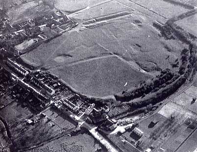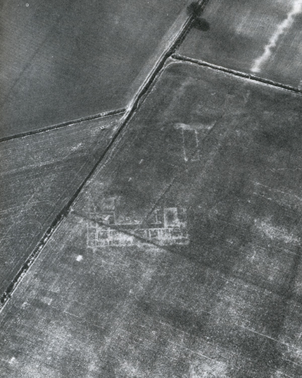 An Iceni iron age fort has been identified at Barnham surrounded by ditches and ramparts. Measuring 105 by 77 yards, it is rated as a small fort by iron age standards. The ditches were 23 feet wide and 10 feet deep, and the ditches were built between 180 BC and 20 AD. This aerial view shows the dark cropmark of a double-ditched trapezoidal enclosure. A small excavation in 1978 showed that it dates from around 100 BC and may have had a religious rather than a military function