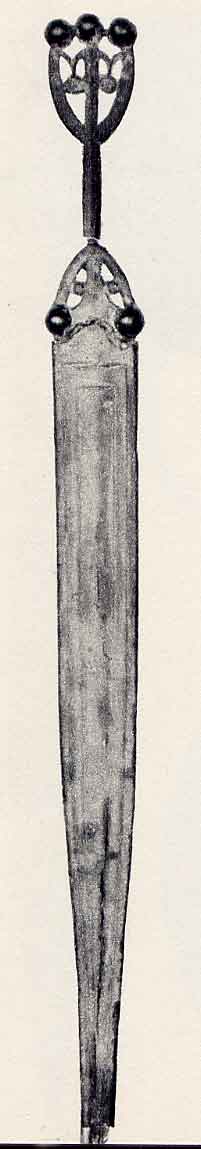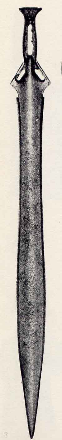 Although the Iron Age had begun, bronze was still in use for fine objects of desire. This bronze sword dates from about 600 BC. A bronze weapon was just as powerful as an iron weapon around 700 BC. It did not rust, and held an edge just as well. They were light, at around 800 grams, and until iron working improved they were still formidable weapons.