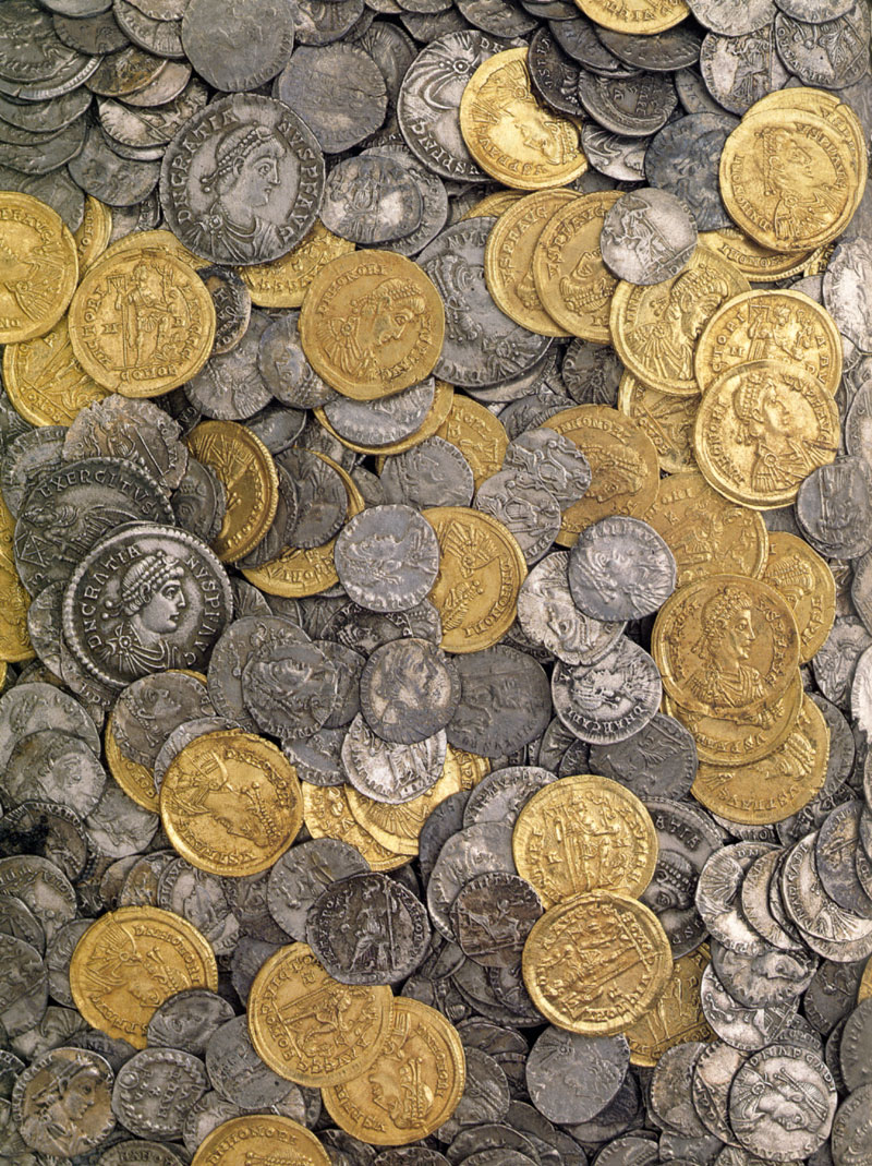 Some time early in the 5th century a massive hoard of nearly 15,000 coins and a large number of household valuables was buried in a wooden chest at Hoxne. Why it was buried and never retrieved, we do not know. Neither do we know who buried it, although some of the pieces are inscribed with the name Aurelius Ursicinus.