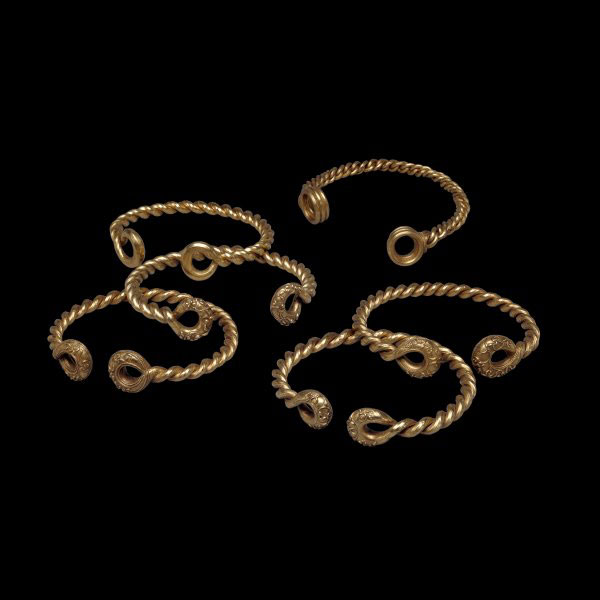 "Each torc was made by twisting two rods of gold around each other. The ends, the 'terminals', were each cast on to the twisted rods using the lost wax technique. Each terminal is hollow, the La Tène-style decoration cut into the clay mould so that it stands up from the surface of the ends, which were then polished. Each terminal, of all the torcs, has a slightly different pattern from its pair. "