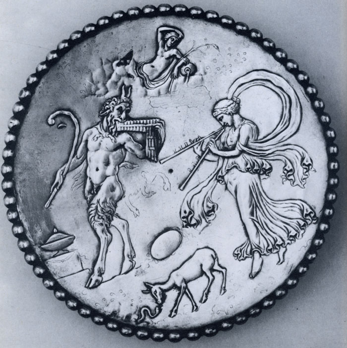 Lupicinus had been sent from Gaul by Julian, who was Caesar of the Gallic Provinces under the auspices of his cousin, the Emperor Constantius II. Julian's close adviser in Gaul was called Eutherius, and this name is scratched into the backs of two of the small plates in the Mildenhall treasure. These platters show pagan scenes of Pan and water nymphs, and one is illustrated here. Eutherius did not go to Britain with Lupicinus, but could have given him the plate in honour of his appointment to the military command of Britain.