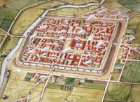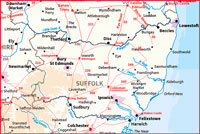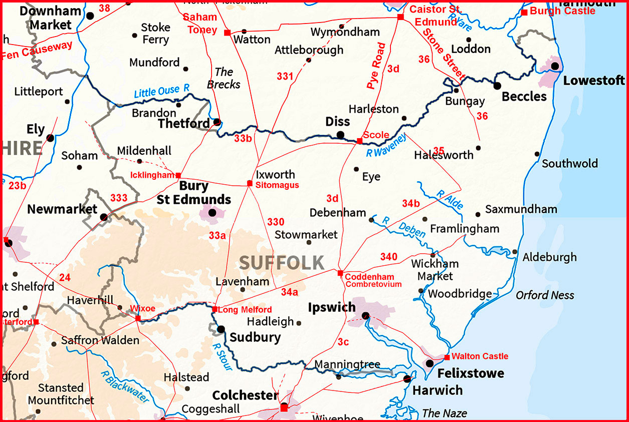 Although the Romans occupied Britain for 400 years, only about 300 place names are left behind, suggesting that they tended to use existing Celtic names. Latin elements can include castra, a Roman town or fort, surviving as -chester or -caster and strata, a Roman road surviving as Strat- or -street. In Suffolk, Newmarket derives from Novum Forum, a Latin form recorded in 1200. However there is little else identified in our county.